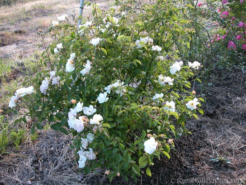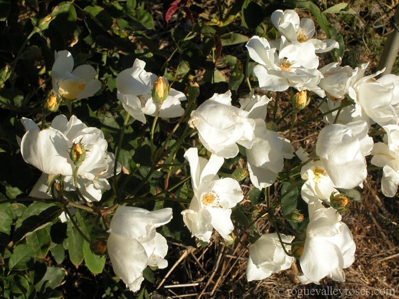 The growth habit of this rose needs to be understood to be placed effectively in the garden. The plant we have is rather like a rounded ball in form with upright branching and dense, healthy leaves. It seems to resent pruning and to contain itself at about four to five feet. The color is pale yellow fading to cream in cool seasons and bloom is at its best in the autumn. In warmer weather the color is cream.