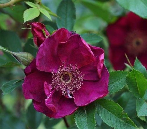 This is one of the most darkly beautiful roses ever from a cross of a rugosa x R. foliolosa. The unique shade of deep purple and the velvety texture is nearly impossible to describe or capture in a photograph. Combine this with stamens of the same deep purple that are bright yellow at the tips, plum colored canes, and purple thorns. This is so beautiful it should not be reserved for the far North. It is adaptable to beach gardens, field or forest edge planting but is lovely enough to be included in the finest rose or perennial gardens as well.