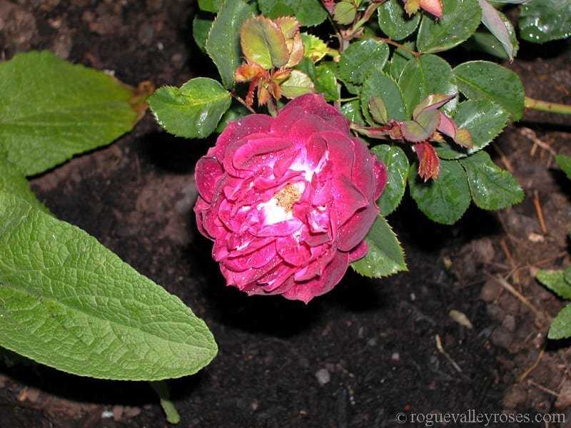 Cardinal Hume spreads wider than it is tall and distinguishes itself with recurring clusters of small double blooms that start a deep crimson and turn dark purple with a lighter reverse. The round scarlet hips are lovely when they are allowed to occur in conjunction with the late fall bloom.