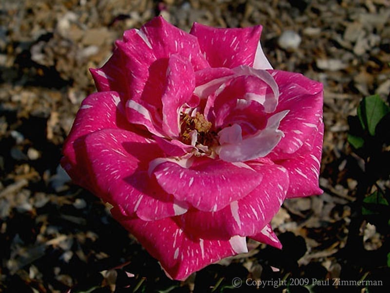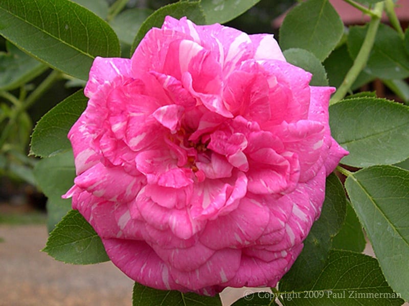 Pink blend, stripes.  Deep pink flecked with white.  Strong fragrance.  Medium, semi-double to double, borne mostly solitary, in small clusters, cupped bloom form.  Blooms in flushes throughout the season.  Large, ovoid buds.
