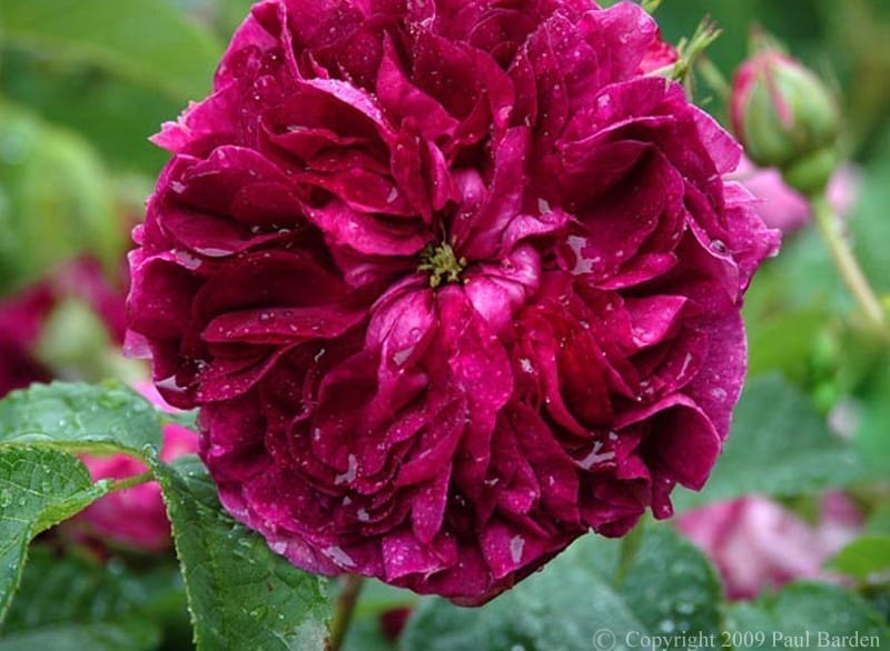 This is certainly one of the most well known of all old roses, undoubtedly because it is one of the most strikingly beautiful. Some authorities feel that it may be ‘Bizarre Triomphant’ from about 1790, making it one of the earliest Gallicas, if this is true. The blooms are large and nearly flat, but lightly cupped at first with the petals tightly packed and radiating out from the center in an interesting way. The flowers are remarkable for their depth of hue and variability, usually containing several shades crimson and purple with tints of black and violet. They last very well and eventually reflex back. This is one of the taller Gallicas but the weight of the blooms cause the branches to arch down. It is easy to grow and vigorous, making a suckering thicket eventually, which can be easily controlled.