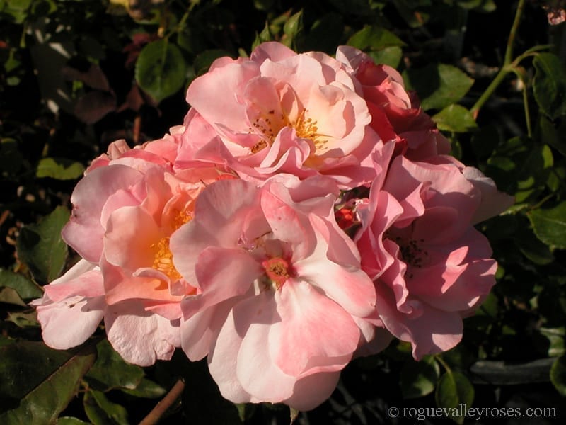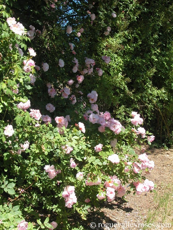 Clair Matin is a fine healthy climber with great rebloom. The semi-double blossoms of clear soft pink have golden stamens and a simple charm that, for me, recalls apple blossoms or even, perhaps, Dainty Bess.
