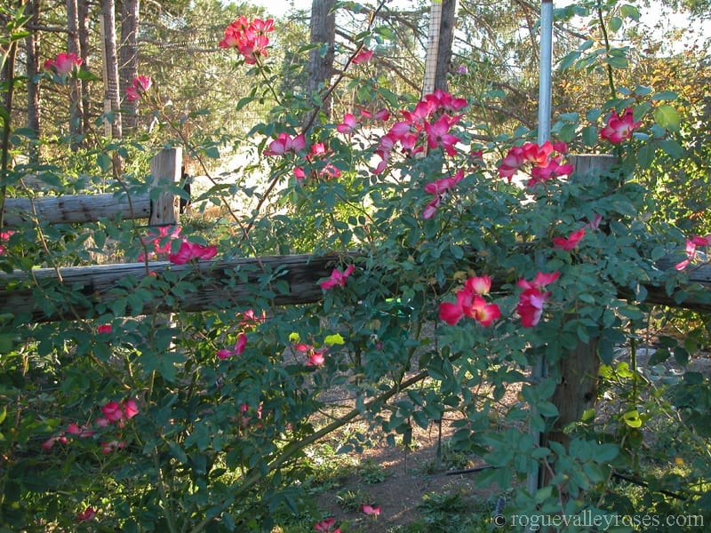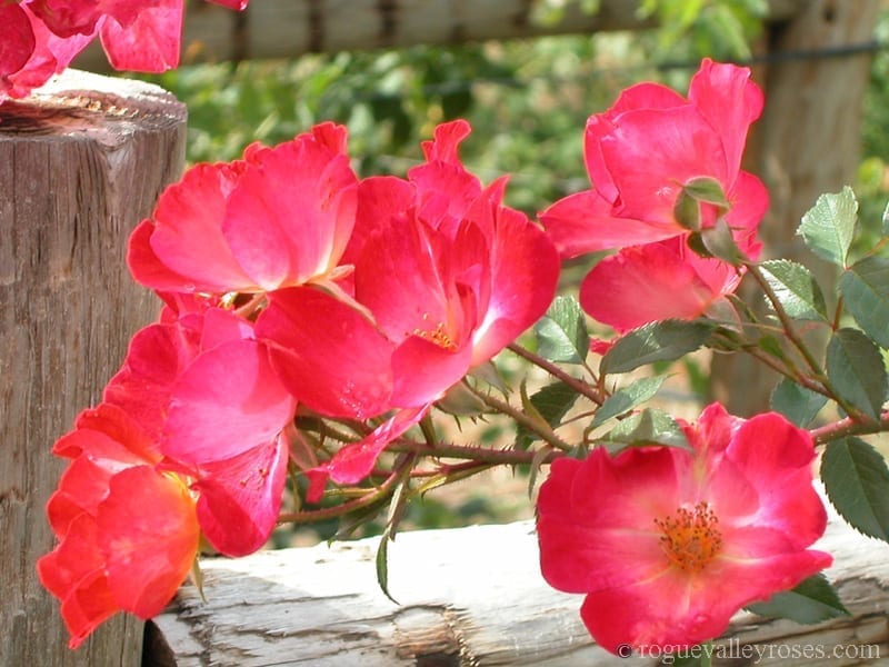 Cocktail is classed as a shrub, but we grow it as a climber on an arch. It is much in demand from visitors to our gardens. Its ruffled bright red single blooms with a yellow eye bring abundant cheerfulness to its spot in the garden. Healthy with very frequent rebloom. Hardy to Zone 5, maybe lower.