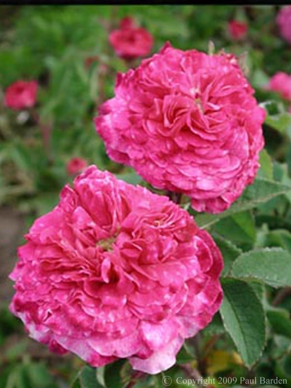 is one of the mottled Pompon or “Ranunculus” type Gallicas. (So named because of the resemblance to the Ranunculus blossom form) Blooms are produced singly and in small clusters and are about 2″ in diameter each…..small for the Gallicas group, but stilll very showy because of the volume of bloom. As you can see here, each blossom is very fully packed with wavy layered petals, each one splashed and spotted with a paler pinkish crimson. The overall color effect is a medium crimson with splashes, not unlike some of the mottled Camelias. There is a very pleasant fragrance as well, and the blooms areproduced in great numbers, and are long lasting. This is also one of the more compact of the Gallicas, with very tidy, almost dwarf growth and very small dark green foliage. It has shown absolutely no disease in my garden and is certainly completely hardy to at least zone 5. It does sucker somewhat, but with restraint and not reaching too far from the mother plant. It forms a tidy thicket in time and is a good choice for a limited space. There is very little surviving historical information about ‘Cramoisi Pictoté’, and so all we know is that it came from J. P. Vibert’s breeding work. It is a testament to its uniqueness and gardenworthiness that it is still extant in commerce. While it may not be the most striking of all its kind, it is a very nice, well-behaved rose of unique character. It is certainly worth seeking out and adding to a collection. Photo and Comment Copyright 2007 Paul Barden and The Uncommon Rose