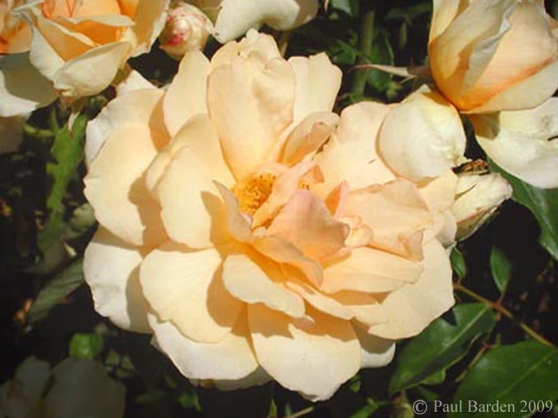 This is a very good rose, healthy and vigorous, whose slender dark green leaves contrast nicely with the crimson new growth. The canes have a graceful way of cascading, or drooping, making it good for flowing down over a terrace wall. The blooms are a luscious apricot butterscotch and nearly continuous. This plant takes awhile to establish itself and can be a slow grower. Be patient and try not to move it. This is not a rose for shade. I have heard that it grows successfully in Zone 6. Photo copyright Paul Barden 2009.