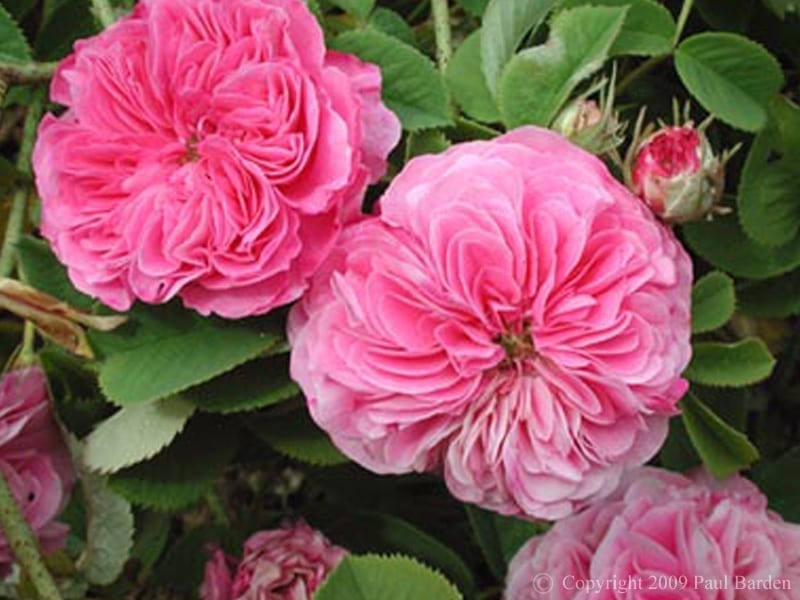 There is a dispute about whether this is a Gallica or a Hybrid Bourbon. The blooms are rounded and packed with petals around a green eye. Very Fragrant. Red fall color.