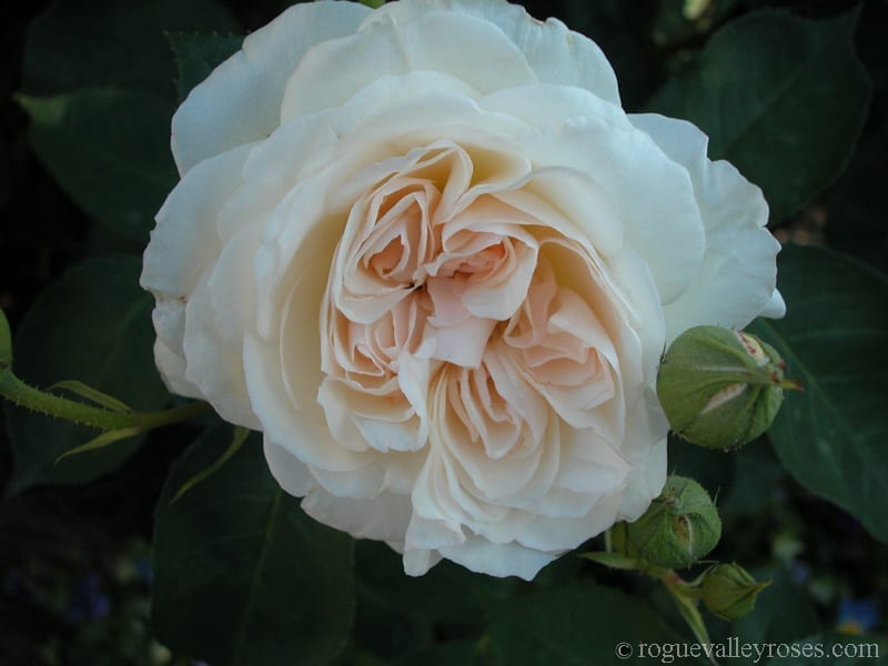 Large sumptuous cupped blooms are basically ivory with various tones of pink, pale yellow or beige, depending on the weather. Very fragrant. Expect it to spend several years building up its climbing structure before you see a lot of bloom. This is a very large climber. Some say it may eventually reach 40′. Reliably hardy to 10 degrees (Zone 8). We grow it here in our Zone 8a/7b, knowing that it could be snatched away from us in the rare winter that hits that mark long enough to wreak havoc on the tender teas. A bit of courage and largesse of spirit helps when you’re pushing zones. In addition one needs to think which micro climates are more protected before placing it in the garden.