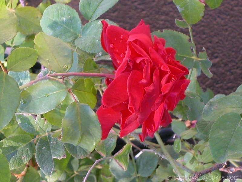This Hybrid Tea, named for the Oregon Govenor who later served as Senator for many years, is little known but distinguished and memorable for the long lasting blooms. The dark red of this rose rather than being recessive, as so many dark reds are, stands out across the garden and lights up its spot. Tolerant of shade more than most HTs.