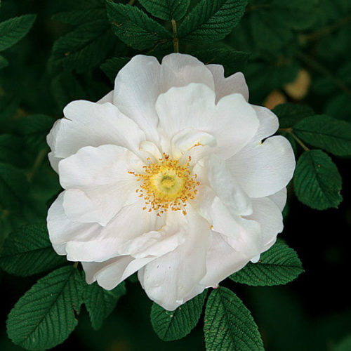 Very disease resistant, very hardy, repeat flowering, clove fragrance. Red hips, often present at the same time as the 3″ snow white, loosely double blooms on a 2′-4′ X 2′-4′ mounding plant. Beautiful foliage, autumn color. A gem. May be an excellent choice for ground cover, planted on 2′ centers in colder locations where the plant stays low (2′). I would like to learn more, from our customers, about the garden performance of this plant in the North.