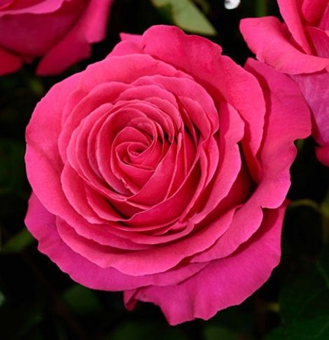 Deep pink Hybrid Tea with strong fragrance. Blooms are large, 6″, borne mostly on single stems, high-centered form, fully double. Very good rebloom. Large buds. Bushy, very disease resistant.