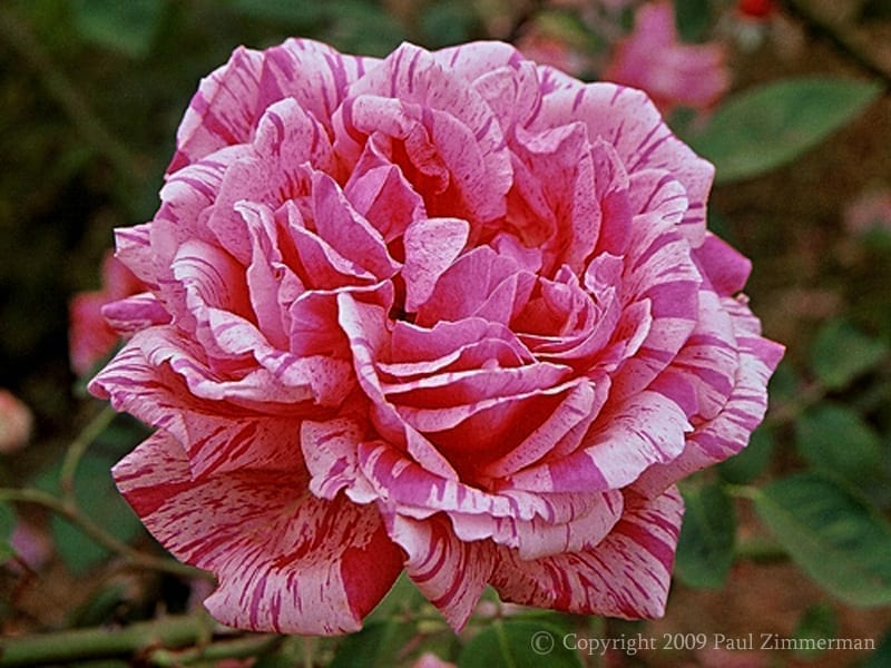 This is a Climbing Tea bred before 1902 by J. Thirat and introduced in France in 1903 by Lucien Bolut in 1903, according to HelpMeFind. Mme. Driout may be grown as a 5′ tall shrub or as a 10′ climber. It has good fragrance and reliable rebloom and is one of the few striped teas—a welcome addition to our collection of Teas. Photo copyright Ashdown Roses