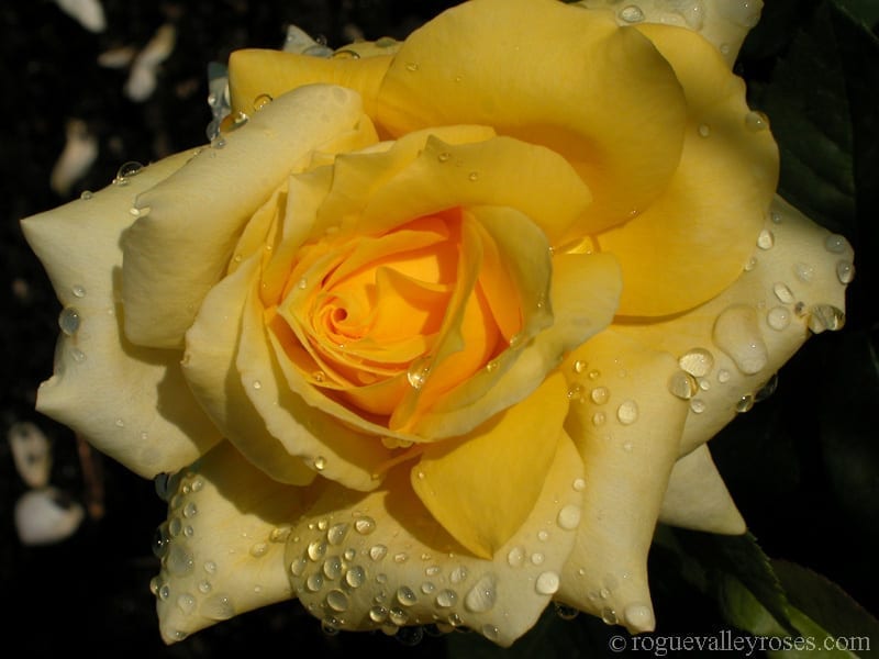 Mme. Marie Curie is a pure vibrant yellow that impresses without being jarring. I love it with deep purple fall asters or pale pink, apricot or white roses. It is planted near Mme. Berard and Mme. Plantier. No other class of roses does ‘big’ better than the Hybrid Teas. This rose, with its beautiful form should do well in shows. It is also fragrant, vigorous, and healthy, hardy to Zone 6. Ours is covered with bloom throughout the season.