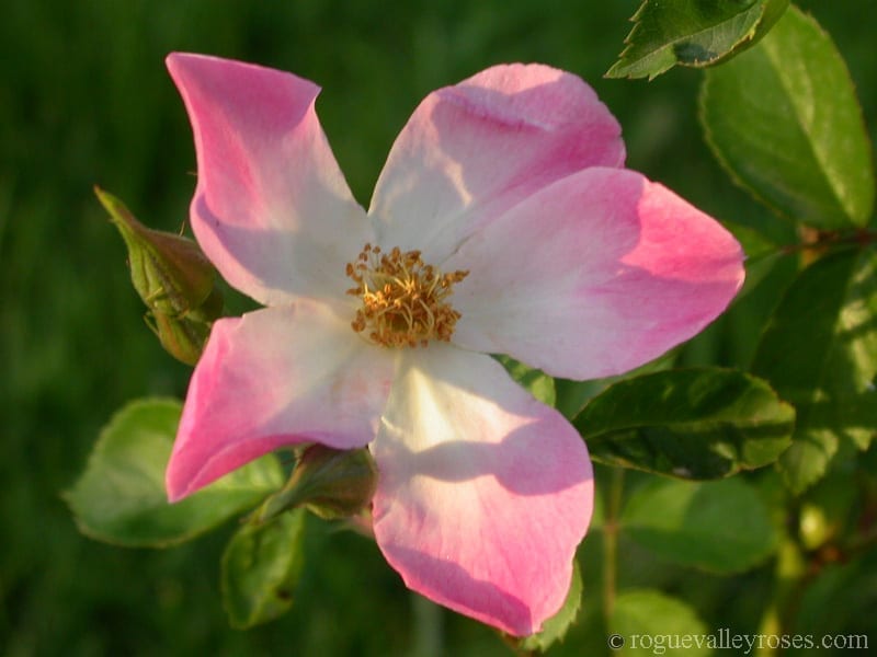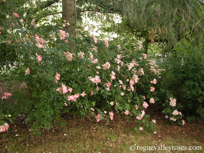 Soft, salmon pink with white eyes and yellow stamens in large clusters. New Face is one of the very few roses that will bloom well even in fairly deep shade. Many visitors remark that it reminds them of a pink dogwood. As you can see its healthy foliage and sparkling clusters in our bush photo, its healthy foliage and sparkling clusters have the ability to light up dark corners. It receives only occasional dappled light where we have it among dark evergreens. We have listed the height at 5′, but we’re noticing a decided willingness to climb in our Zone 8 climate. It can easily be kept to a modest height, however.