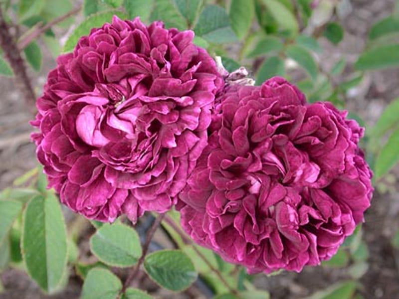 Nearly black, violet mauve, heart-shaped petals. Dark moss and modest growth. Moss and bloom are nicely scented. It does sucker and spread, but can easily be controlled. Pure romance. The name, Nights of the Young is perfect! Photo copyright Paul Barden 2008