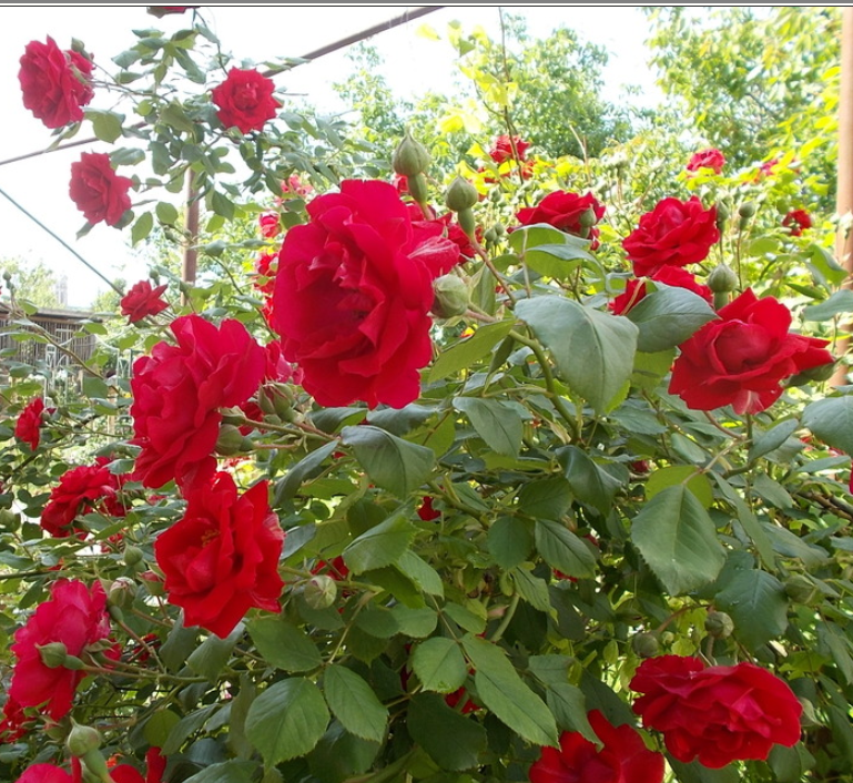 Scarlet, crimson shading, ages to cherry-red . None to mild fragrance. Average diameter 2.75″. Medium, semi-double to double, in small clusters, cupped bloom form. Occasional repeat later in the season.