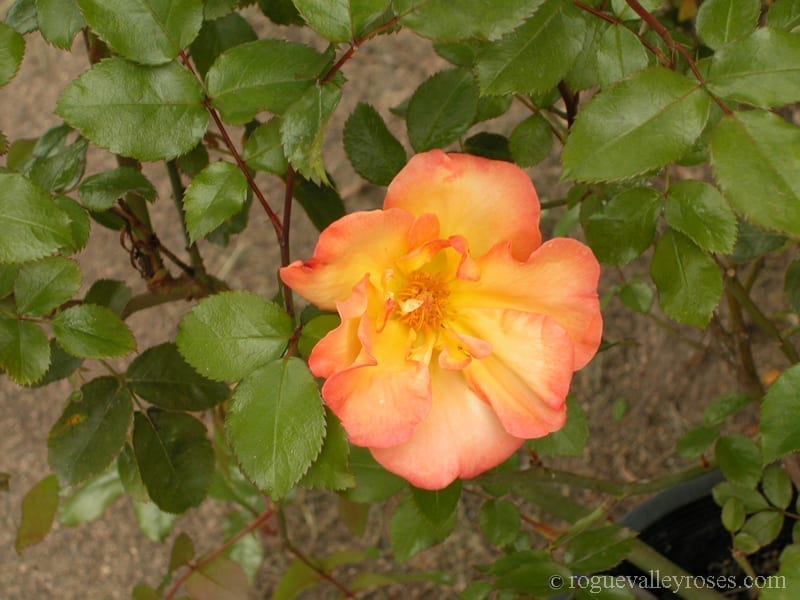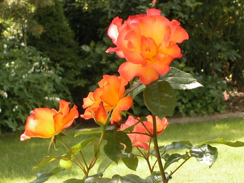 Orange with an overlay of scarlet and a yellow eye. Constant bloom, among the most vivid roses grown and one of the most popular. Awards: Portland Gold Medal 1989.