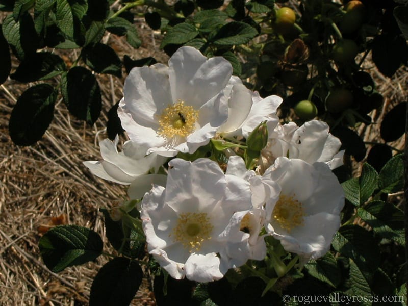 a.k.a White Rugosa Spicy fragrance, and large red hips juxtaposed next to white satiny blooms on lovely pleated foliage that is very disease resistant makes R. rugosa alba one of the most requested rugosas.