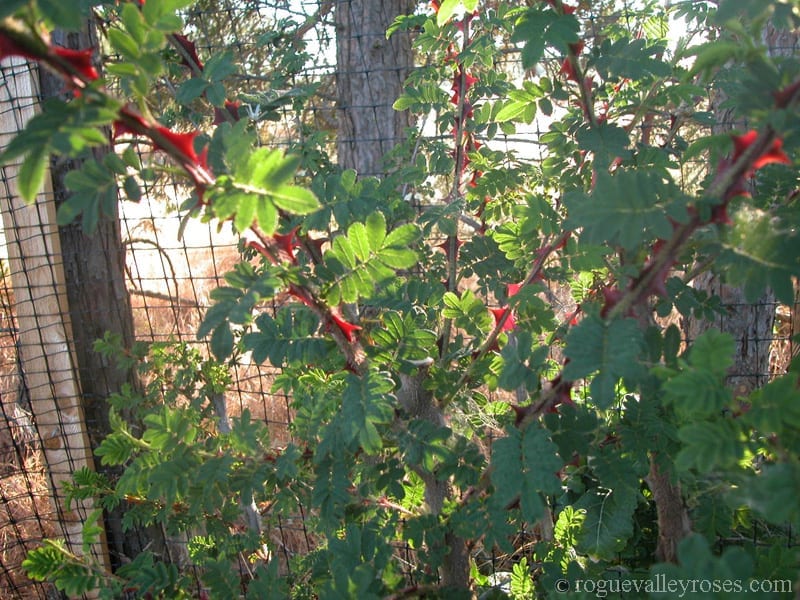 Native along streams in China, grown for the enormous, elongated thorns on arching new canes which are translucent and red, stunning and beautiful, full of fire when backlit by the sun. Delicate ferny foliage. Flowers white with four petals, arrayed along the top of the branches like a dusting of snow. Small,delicious, juicy, hips.  After plant is established remove several old canes annually to maintain vigor of bush and to insure new canes with firethorns. Very diffult to propagate.  Often several years between successful batches.  We now have a limited number of plants available in band pots only.