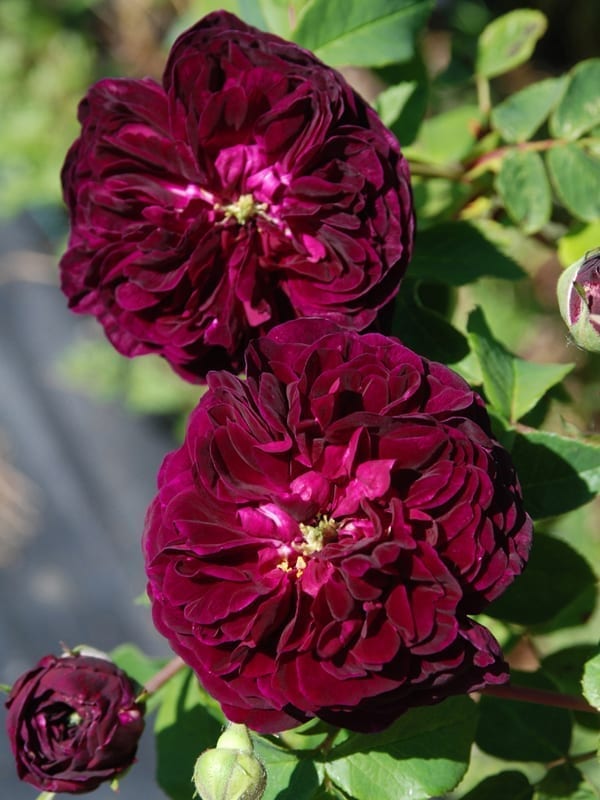 Rook is described by Paul as having “spectacular color of an intense deep crimson, approaching black-crimson. Rook is one of the darkest Gallicas I have ever seen.” Blooms come in clusters of three to five. Bloom form is a flat rosette that is sometimes quartered, sometimes with a button eye. Petal count is a minimum of 50, maximum of 80. There is a moderate spicy scent. The rounded compact bush has dark green, matte foliage, will sucker modestly, and looks lovely planted in among lighter flowered Gallicas, such as Camaieux. Rook is hardy to at least Zone 5a and possibly much colder. Winter protection is not required. Excellent addition to an OGR bed where a smaller specimen is needed. Photo copyright Paul Barden 2008.