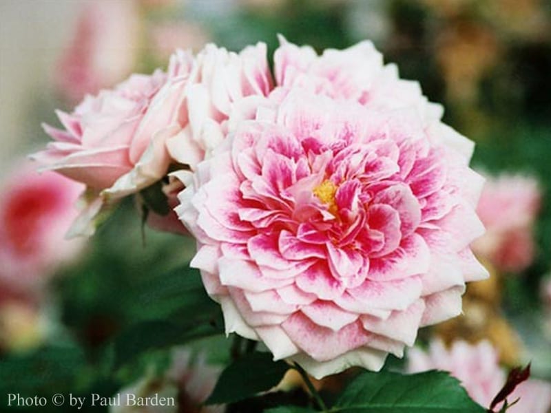 Paul Barden has this to say: “This fantastic rose is one of the many spectacular roses from Ralph Moore. This rose was bred in the late 1970’s and Mr. Moore finally decided to release it into commerce in 2004 (He pondered its merits for many years, considering it to be too similar to the rose ‘Regansberg’. While there are similarities, I think ‘The Dahlia Rose’ is a much nicer rose and it has much fuller blooms.) Near-white petals have deep raspberry splashes at the bases, making for a very showy bloom. It produces blooms in cluster of up to five, and each bloom is 3 to 3.5 inches across. The only thing missing is fragrance. The shrub itself is not overly large, growing to about 2.5 feet tall, and slightly wider, depending on climate. The deep green foliage is quite disease resistant. The whole effect is that of a broad Floribunda style rose, and it blooms so profusely that the blooms nearly obscure the bush.” Photo copyright Paul Barden 2008