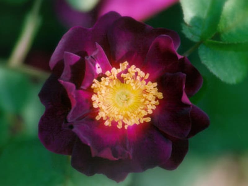 The two photos here show the variability of our very vigorous plant of this rose. Usually the blooms distinctly show the circlet of golden stamens, but they can also appear so double as to hide them. This is a very distinguished Gallica and one of the blackest crimson or purple roses in existence. It and its progenitor, ‘Tuscany’, have been used extensively by Paul Barden in his quest for deep purple roses. I find the combination of the depth of color and the rich velvet texture of the petals set off by the prominent golden stamens to be breathtaking. Photos copyright Paul Barden 2008.